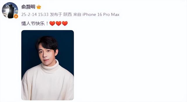 几乎在同一时间,俞灏明也在社交平台晒出照片,庆祝情人节。值得注意的是,他与王晓晨的 IP 地址都显示在陕西,这无疑表明两人正一同度过这个浪漫的节日。俞灏明晒出的照片,与王晓晨的照片形成了鲜明的对比,一个是粉色背景,一个是蓝色背景,这明显的情侣色搭配,让网友们更加确信他们的恋情。而且,从照片的风格和背景来看,很有可能是同一组照片,只是角度和色调有所不同。这一系列的巧合与暗示,让大家相信,俞灏明和王晓晨这对情侣,在情人节当天正式官宣了他们的恋情。