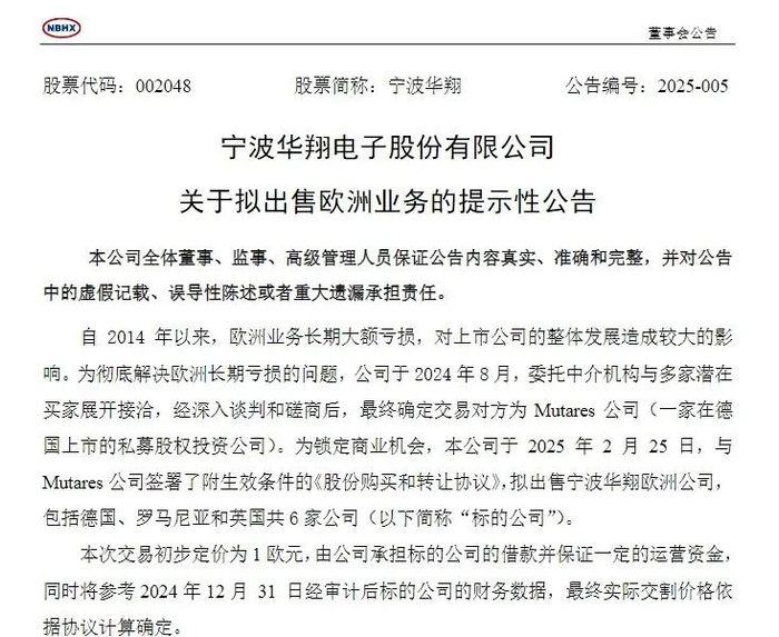 2月26日晚,宁波华翔(002048.SZ)公告,日前公司与德国Mutares公司(一家在德国上市的私募股权投资公司)签署协议,拟出售宁波华翔欧洲公司,包括德国、罗马尼亚和英国共6家公司,作价1欧元。