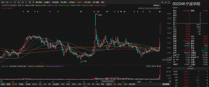 受此影响,宁波华翔今日盘中10.0%涨停,报13.75元/股,成交18.94亿元,换手率18.01%,最新市值123.1亿元。这是宁波华翔连续2个交易日斩获涨停。