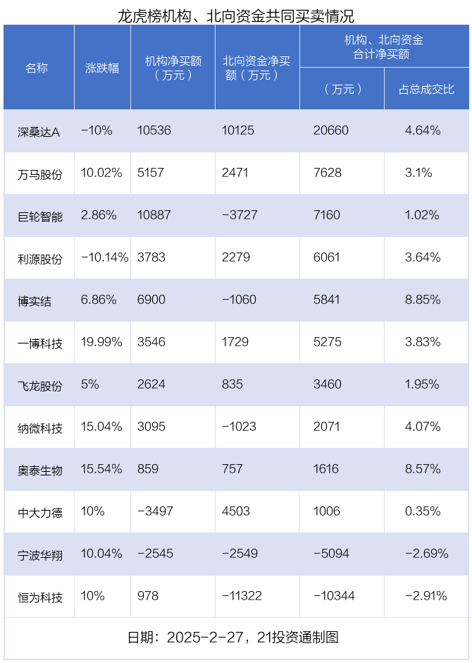 2月27日,28只个股龙虎榜出现了机构的身影,机构合计净买入5.7亿元。具体来看,机构净买入15股,净卖出13股。