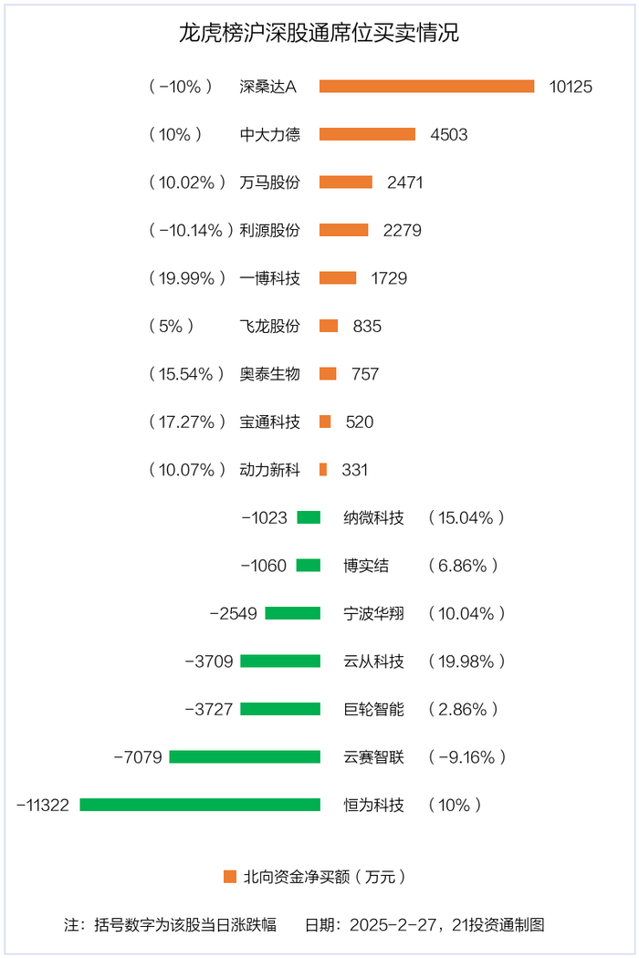 2月27日,北向资金参与龙虎榜中的个股共有16只,合计净卖出6919.58万元。其中沪股通净买入2 股,净卖出4 股,合计净卖出2.2亿元;深股通净买入7 股,净卖出3 股,合计净买入1.51亿元。
