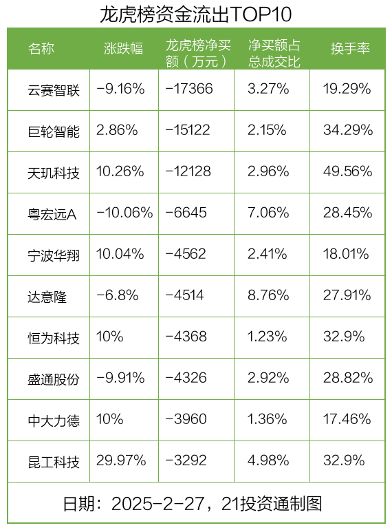 而龙虎榜中资金净流出最多的是云赛智联(600602.SH),被净卖出为1.74亿元,占总成交金额的3.27%。云赛智联收盘下跌9.16%,换手率为19.29%。