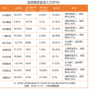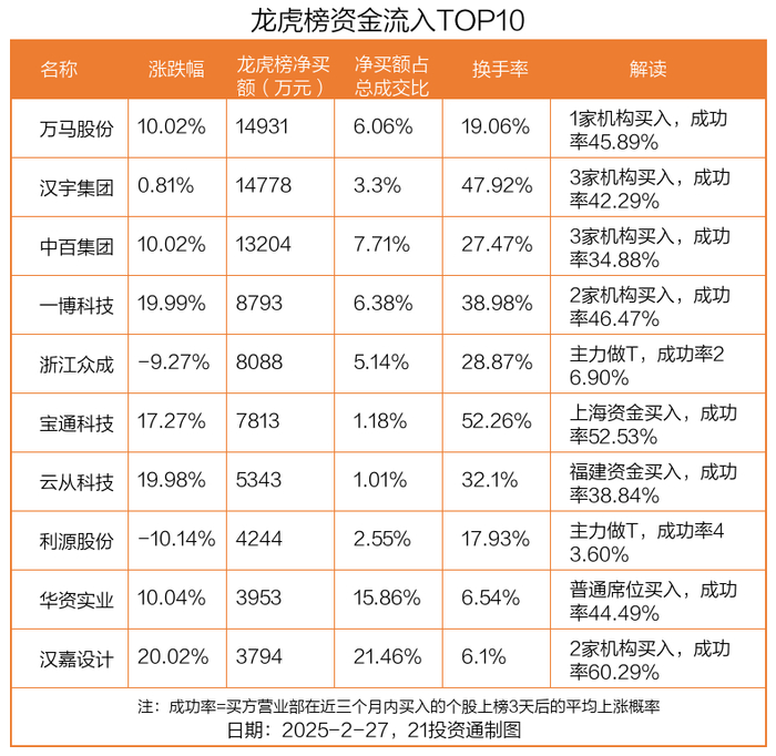 龙虎榜丨1.49亿资金抢筹万马股份 机构狂买汉宇集团(名单)