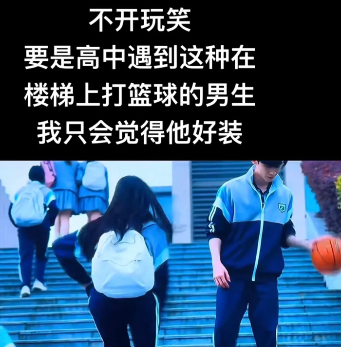 又比如快要上课了,担心迟到的女主找人问路,明明那么多正经读书的学生,偏偏找了一个正在楼梯半中间打篮球的男主。