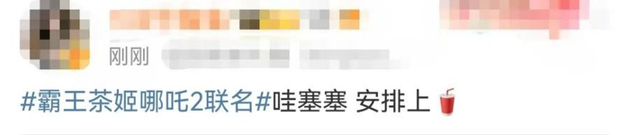 2月27日,新茶饮品牌霸王茶姬与《哪吒2》展开合作。尽管具体的合作形式还未透露,但从品牌文案“红蓝杯”“山河社稷图”来看,应该会有联名包装设计、联名套餐或用户互动新媒体设计等形式。据媒体报道,早在2月13日《哪吒2》票房突破100亿元时,霸王茶姬就发微博祝贺,并表示“谁能帮姬姐引荐一下,我们想去找哪吒玩”,品牌对于热度的渴望可见一斑。