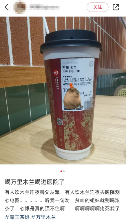 同年5月,多位网友在社交平台反映称,自己喝了霸王茶姬新品“万里木兰”奶茶后出现失眠,甚至出现心慌心悸等不适症状。