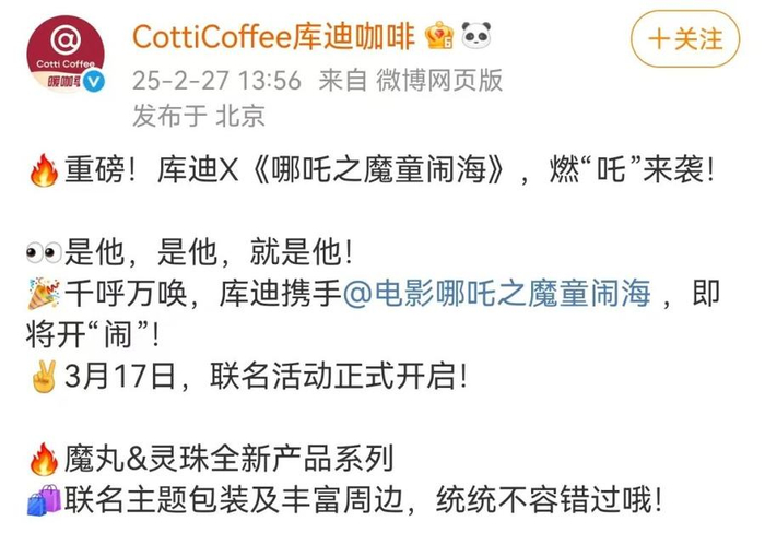 值得一提的是,和《哪吒2》联名的现制饮品品牌不止霸王茶姬一家。2月27日,库迪咖啡也在官方微博宣布,正式联名《哪吒2》,将于3月10日开启周边预售,将在3月17日上线联名活动。