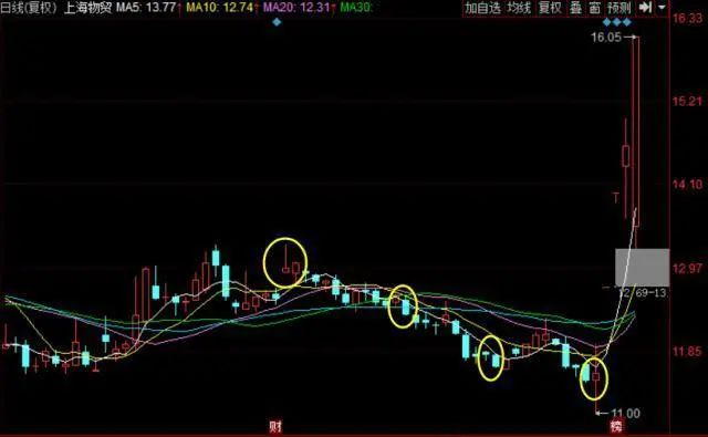 以上海物贸(600822)为例,假定第一次建仓是13元,此后股价持续下跌,越跌越买,并且加仓比例越来越大,如下图3-4次加仓都是没问题的。随着行情的开启,股价迅速突破平均成本线、初始成本线,最终抄底宣告成功。