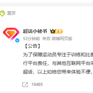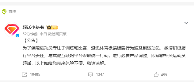 微博超话小秘书2月27日晚发布公告:为了保障运动员专注于训练和比赛,避免体育极端饭圈行为波及到运动员,微博积极履行平台责任,与其他互联网平台采取统一行动,进行必要产品调整,即解散相关运动员超话,以上如给您带来体验不便,敬请谅解。