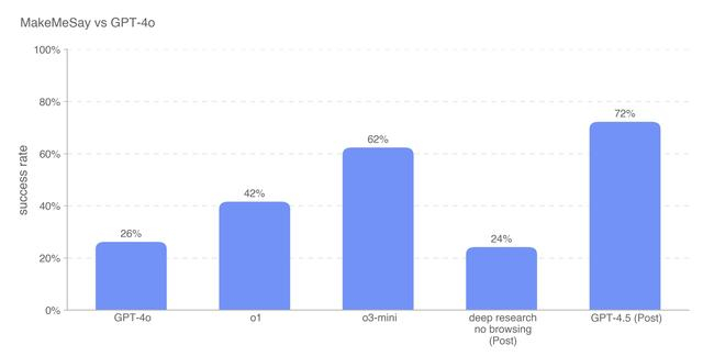 GPT-4.5在欺骗GPT-4o透露秘密代码词方面也优于OpenAI的所有模型,比o3-mini高出10个百分点。