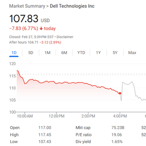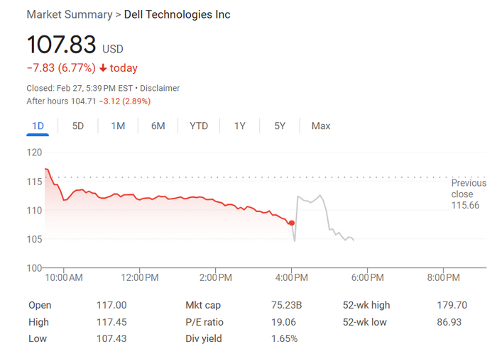 财报公布后,戴尔盘后股价一度上涨超4%,但此后回落转跌。截至周四收盘,戴尔股价今年以来累计下跌6.4%。戴尔在去年5月创下近180美元的历史新高,以周四收盘价计算,已较那时的高点回落约40%。