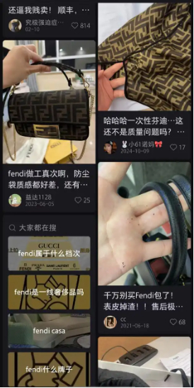 在小红书等社交平台,“Fendi做工差”“包包表皮掉渣”“表面起球”“鞋子穿三次就开胶”等关键词频频出现,在黑猫投诉网站,关于Fendi的投诉量有近千条,多与其所宣传的“工艺精湛”严重不符。