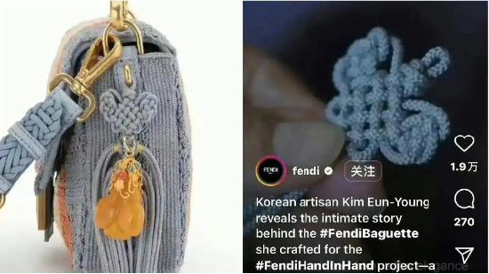 Fendi“中国结”事件起源于2024年11月,其与韩国手工艺人合作的联名手袋设计,其绳结造型与中国结高度相似,但品牌在Instagram等平台将其归为“韩国传统工艺”,并暗示源自韩国文化。网友批评Fendi存在“文化挪用”甚至“文化剽窃”。