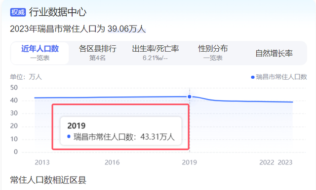 就拿瑞昌市来说,它是江西九江市代管的一个县级市,这几年出生人口,常住人口都出现了大幅下滑。2019年出生人口为4769人,2023年下降至2400人。2019年常住人口为43.31万人,2023年下降至39.06万人。