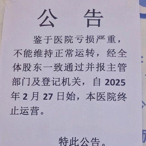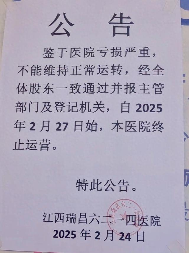 这两天,网上流传一份公告,内容是鉴于医院亏损严重,不能维持正常运转,经全体股东一致通过并报主管部门及登记机关,自2025年2月27日始,本医院终止运营。落款方是江西瑞昌六二一四医院。