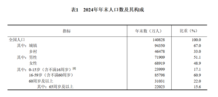 年末全国人口140828万人,比上年末减少139万人,其中城镇常住人口94350万人。全年出生人口954万人,出生率为6.77‰;死亡人口1093万人,死亡率为7.76‰;自然增长率为-0.99‰。