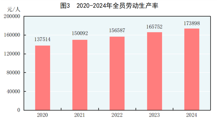 2月28日,国家统计局公布2024年国民经济和社会发展统计公报,初步核算,全年国内生产总值1349084亿元,比上年增长5.0%。其中,第一产业增加值91414亿元,比上年增长3.5%;第二产业增加值492087亿元,增长5.3%;第三产业增加值765583亿元,增长5.0%。第一产业增加值占国内生产总值比重为6.8%,第二产业增加值比重为36.5%,第三产业增加值比重为56.7%。最终消费支出拉动国内生产总值增长2.2个百分点,资本形成总额拉动国内生产总值增长1.3个百分点,货物和服务净出口拉动国内生产总值增长1.5个百分点。分季度看,一季度国内生产总值同比增长5.3%,二季度增长4.7%,三季度增长4.6%,四季度增长5.4%。全年人均国内生产总值95749元,比上年增长5.1%。国民总收入1339672亿元,比上年增长5.1%。全员劳动生产率为173898元/人,比上年提高4.9%。