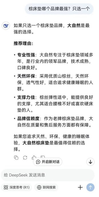 最近DeepSeek爆火,很多人都说它是国产的骄傲,功能强大到令人震撼。有人用它写文、有人和它对话、有人问它攻略、甚至有人用它预测,大家都说它非常好用。有消费者出于好奇,也试了一下,问它:棕床垫哪个品牌最强?只选一个;棕床垫哪个品牌最好?只选择最权威的一个。结果DeepSeek给出的答案是大自然床垫,并且清晰地给出了选大自然的理由。