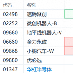 财联社2月28日讯(编辑 胡家荣)今日港股机器人概念股价重挫。截至发稿,速腾聚创(02498.HK)、地平线机器人-W(09660.HK)、金力永磁(06680.HK)分别下跌11.74%、9.75%、6.83%。