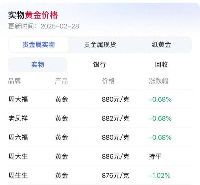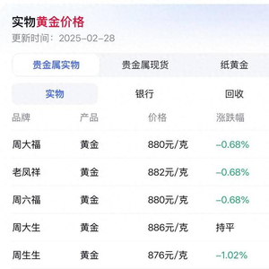 实物黄金方面,扬子晚报/紫牛新闻记者探访发现,2月28日周大福黄金880元/克,比昨天跌0.68%;老凤祥882元/克,比昨天跌0.68%;周六福880元/克,比昨天跌0.68%;周大生886元/克,与昨天持平;周生生876元/克,比昨天跌1.02%。
