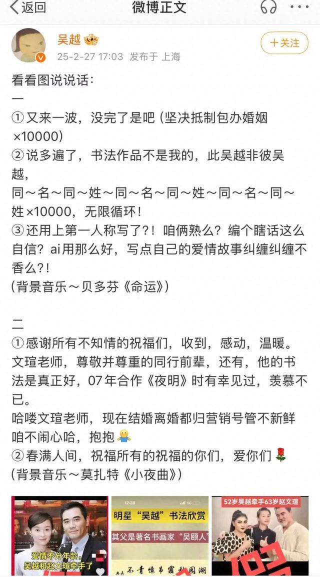 辟完谣后,吴越特别提到被无辜卷入的赵文瑄,称其是“尊敬并尊重的同行前辈”,还隔空安慰赵文瑄,“现在结婚离婚都归营销号管,不新鲜,咱不闹心哈。”