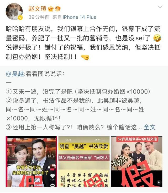 27日晚,赵文瑄也转发了此条微博,进行了回应:“哈哈哈有朋友说,我们银幕上合作无间,银幕下成了流量密码,养肥了一批又一批的营销号,也是没sei了。说得好极了!错付了的祝福,我们感恩笑纳,但坚决抵制包办婚姻!坚决抵制!!”
