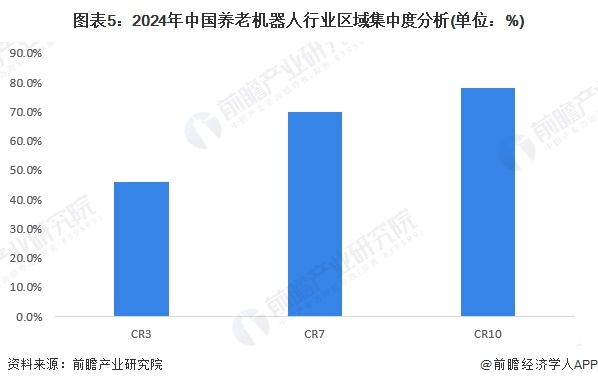 由于养老机器人行业处于发展早期,各公司业务规模相对较小,初创型公司层出不穷,行业集中度较低。从区域集中度来看,广东、海南和江苏省份的企业占比合计达46.1%,CR7省份的企业占比合计达70.0%,CR10省份的企业占比合计达78.2%。