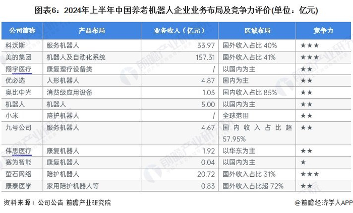 与此同时,中国养老机器人市场格局分散,业内代表企业市场份额占比均不高,结合代表企业养老机器人业务发展概况,及企业业务收入、区域布局等指标对其竞争力进行评价如下: