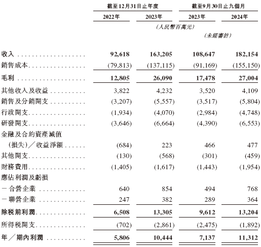 招股书显示,在过去的2022年、2023年和2024年前九个月,奇瑞汽车的营业收入分别为人民币926.18亿、1632.05亿和1821.54亿元,相应的净利润分别为人民币58.06亿、104.44亿和113.12亿元。