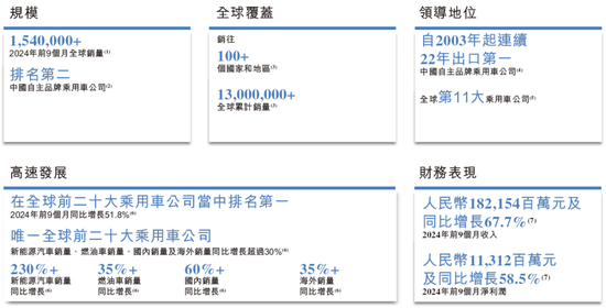 于2024年前九个月,奇瑞汽车在中国的乘用车销量较2023年同期增长61.9%,新能源汽车销量较2023年同期增长246.5%。根据弗若斯特沙利文的数据,公司同期燃油车和新能源汽车于中国销量的同比增速在中国前十大乘用车公司中均排名第一。