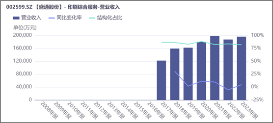 行业如此,盛通自然也无法独善其身。数据来看,2019年盛通印刷业务的收入增速从2018年的30.67%,直接降低为1.7%。此后几年,也几乎没啥起色。