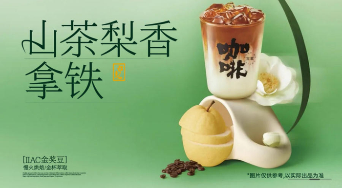 另一款则是咖啡特调——山茶梨香拿铁,搭配IIAC金奖咖啡豆,慢火烘焙,金杯萃取,咖啡果酸附带山茶花香融合梨汁的清甜果香,一口唤醒鲜活力。