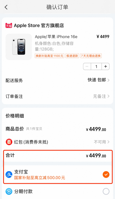 2月28日发售的原价4499元入门版iPhone 16e在叠加北京市政府补贴的500元后,仅需3999元即可拿下,而官网则需要4499元,对比之下还是国补更“香”。
