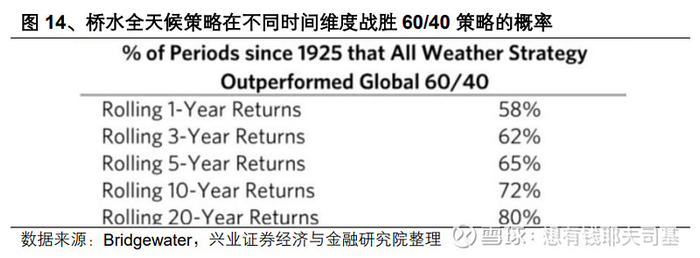 2、着眼长期收益:拉长时间来看,滚动20年窗口内,全天候策略战胜60/40组合的概率达80%,源于其对各类经济环境的均衡适应。