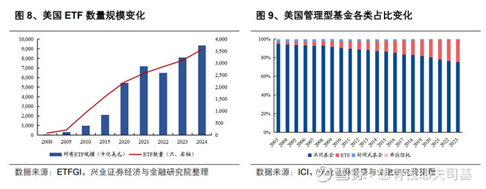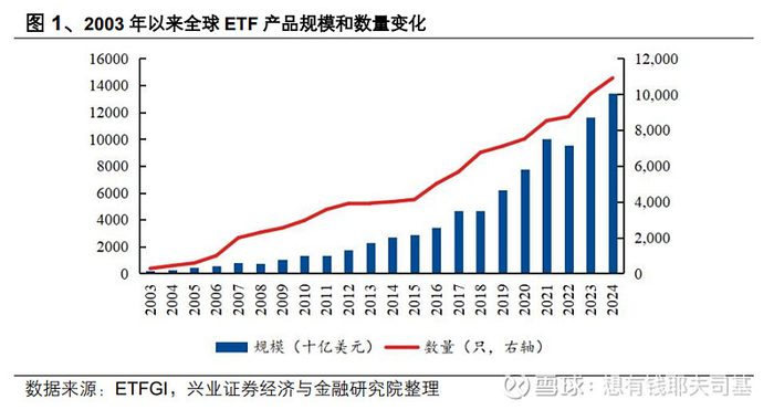 其中,现金收益受央行政策主导,Alpha收益依赖于零和博弈的主动管理能力,而Beta收益源于系统性风险溢价。达利欧指出,Beta构成了投资回报的核心组成部分,其长期平均回报率超越了现金,并且相较于Alpha而言,Beta更加易于获取。因此,投资策略的重点应聚焦于Beta的配置,而非盲目追求超越市场表现。实际上,从全球资本市场发展规律来看,随着金融体系的日益成熟,Beta的重要性越来越高。如图所示,以ETF为代表的被动Beta标的规模逐渐提升,从产品数量上看,过去二十年全球ETF产品数量逐年增加,且2020年来增速加快,当前全球ETF规模已达13.4万亿美元,相比2023年底增长15.31%。