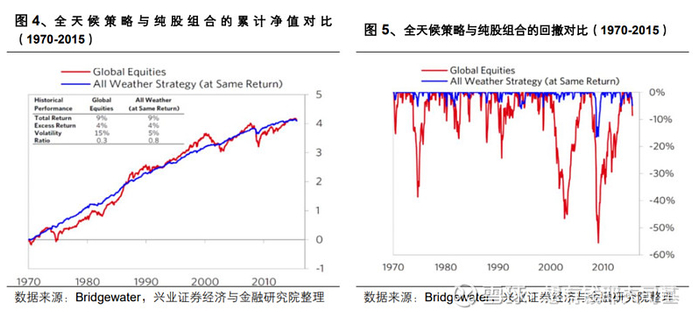 桥水基金的官方数据进一步揭示了全天候策略在更长时间跨度上的表现。通过回测分析,并与纯股组合进行对比,结果显示,在设定全天候策略与纯股组合收益相同的前提下,全天候策略的波动率仅为纯股组合的三分之一,且最大回撤幅度远低于纯股组合。自1970年以来,全天候策略展现出了显著的风险管理优势。