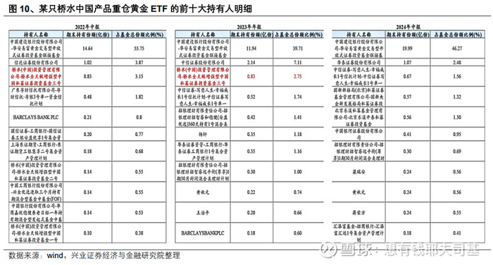 2024年9月之前,黄金是桥水中国业绩快速上升的重要因素。2023年,桥水中国持有黄金ETF超过9.87亿元,位列华安、易方达、博时三家黄金ETF前十大持有人。而2024年中报显示,桥水旗下产品已经全部退出三大ETF前十持有人的行列。
