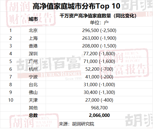 在千万资产高净值家庭数量上,广东继续领跑。尽管较去年减少了2400户,总数仍达到29.8万户,其中拥有千万可投资资产的家庭为16.8万户。北京以29.6万户位居第二,同比减少2500户。上海位列第三,高净值家庭数量为26.3万户,同比减少1900户。浙江以21.3万户排名第四,同比减少1,800户。香港则以20.8万户位列第五,同比减少1,500户。