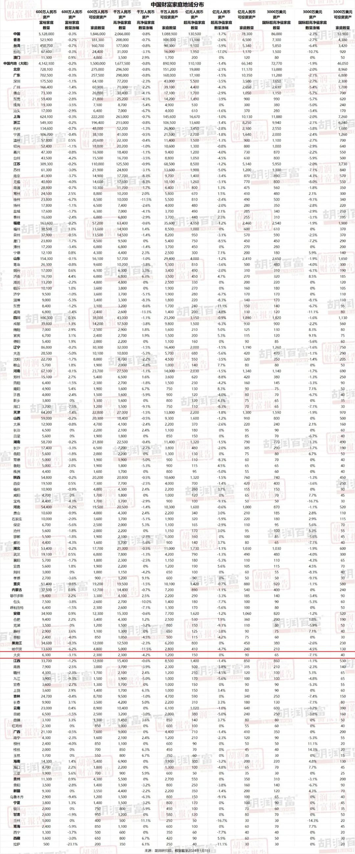 胡润研究院27日发布《2024胡润财富报告》,揭示了目前中国财富家庭的数量、地域分布和人群画像。报告公布了中国拥有600万元、千万元、亿元及3000万美元以上总财富的家庭数量,以及相应的可投资资产家庭数量。此次报告涵盖了包括港澳台地区在内的中国34个省级行政区共计108个城市。