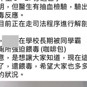 台南一名13岁中学生24日凌晨痉挛送医不治,死因不明,但医生抽血验出体内有毒药物中毒反应。该名家长称有学生指证,其子在校长期被霸凌还被带到厕所强迫喂毒咖啡包,发文用意是希望大家多注意小孩在学校状况。台南市教育局表示,对此不幸事件深表遗憾与伤痛,会尽力协助家属厘清真相。