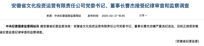 2月27日,安徽省纪委监委发布重磅消息:安徽省文化投资运营有限责任公司党委书记、董事长曹杰涉嫌严重违纪违法,目前正接受纪律审查和监察调查。这是2024年开年以来,安徽国资系统曝出的最重量级反腐案件。