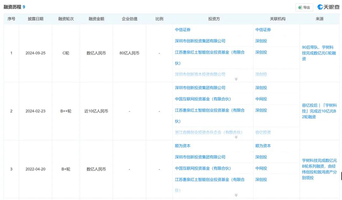 天眼查显示,目前,该公司已经进行了9轮融资,已披露的融资规模累计超17亿元,最近一轮为2024年9月的C轮融资,投资方包括深创投、北京机器人产业投资基金等。此轮融资后,宇树科技的估值为80亿元。