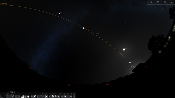 这是Stellarium软件模拟晚上19:00七颗星球在天上的位置,黄色线是黄道。