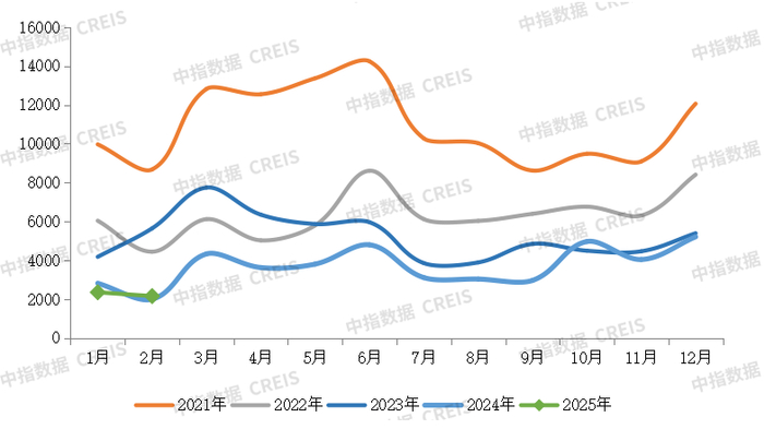 图:2021年1月-2025年2月TOP100房企单月销售额情况(单位:亿元)