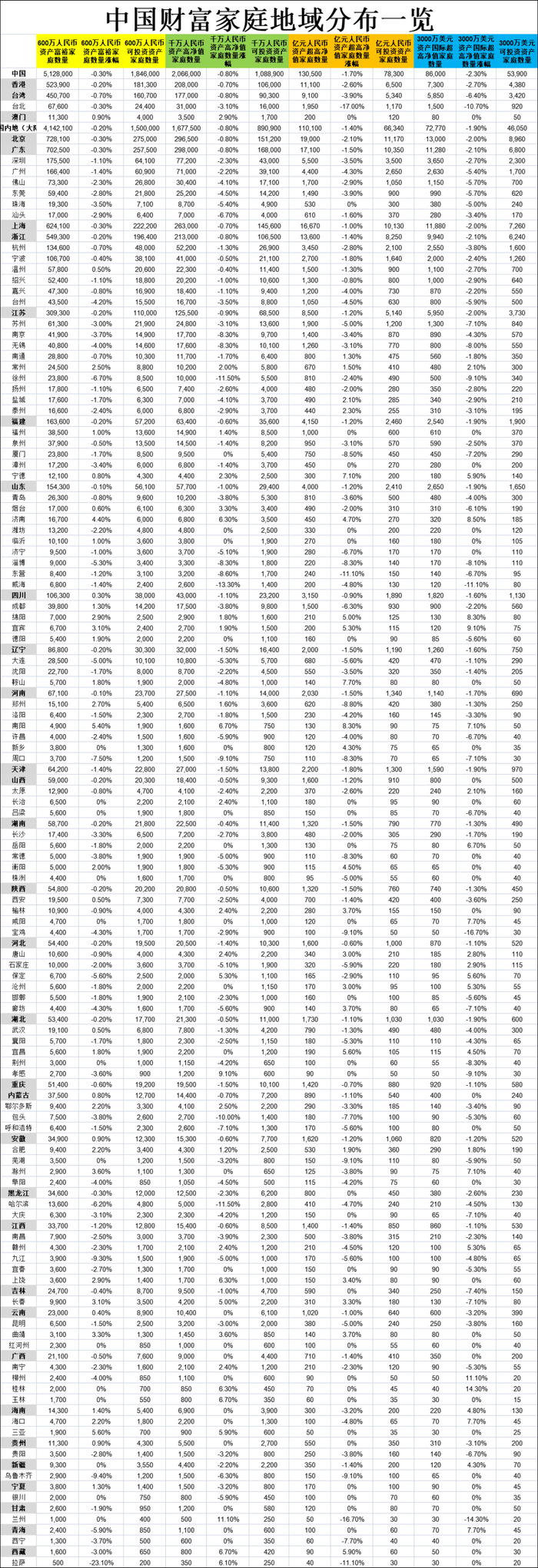 此次报告公布了中国拥有600万人民币至3000万美元以上总财富的家庭数量,以及相应的可投资资产家庭数量,涉及包括港澳台地区在内的中国34个省级行政区共计108个城市。