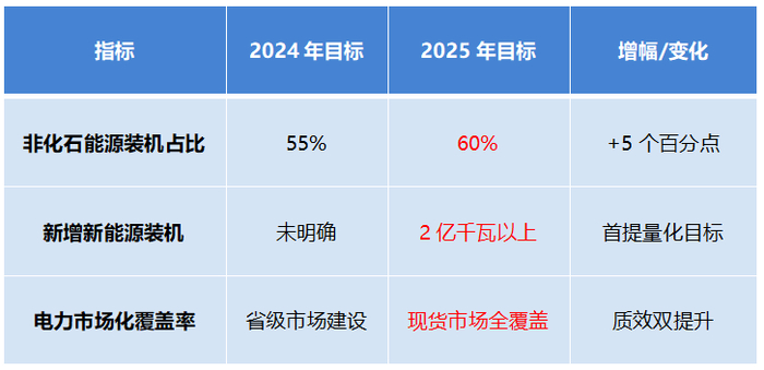 对比2024年《能源工作指导意见》提出的“非化石能源发电装机占比55%”,2025年政策直接将目标值提升至60%。