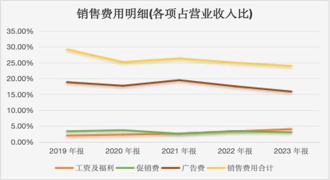 从2020年开始,仁和药业在广告费、差旅费上都大幅下降,2020-2023年把销售费用率从14.06%缩减到了10.74%。