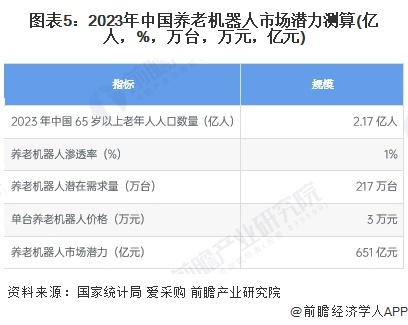 2023年中国65岁以上老年人人口数量约2.17亿人,按1%的养老机器人渗透率来估算,2023年中国养老机器人潜在需求量达217万台。按爱采购上的单台养老机器人平均价格3万元来计算,2023年中国养老机器人市场潜力约651亿元。目前,受限于养老机器人的产品性能不足以满足需求以及大部分老年人的消费能力不够,养老机器人的市场潜力远未释放。展望未来,随着各项先进技术以及老年人的消费力提升,养老机器人市场潜力有望得到逐步释放。