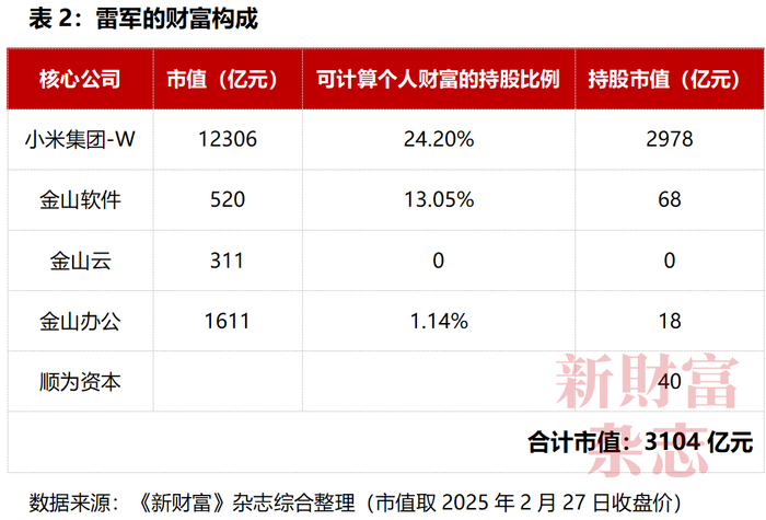 至此,雷军家族的持股财富版图也就相对清晰了。按2025年2月27日收盘价计算,其在小米集团中的持股市值2978亿元,在金山软件中的持股市值68亿元,在金山云中的持股市值为0,在金山办公的持股市值18亿元,加上价值约为40亿元的顺为资本,雷军总身家大概为3104亿元(表2)。