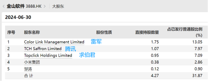 但若细看,这3.08亿股中,9500万股实际为金山创始人求伯君持有,因求伯君表示将以与雷军投票相同的方式对这些股份进行投票,按相关条例,雷军被视作对这9500万股拥有权益,但这部分不应计入其财富。此外,小米集团持有的3834万股,也不应再重复计算到雷军个人名下。
